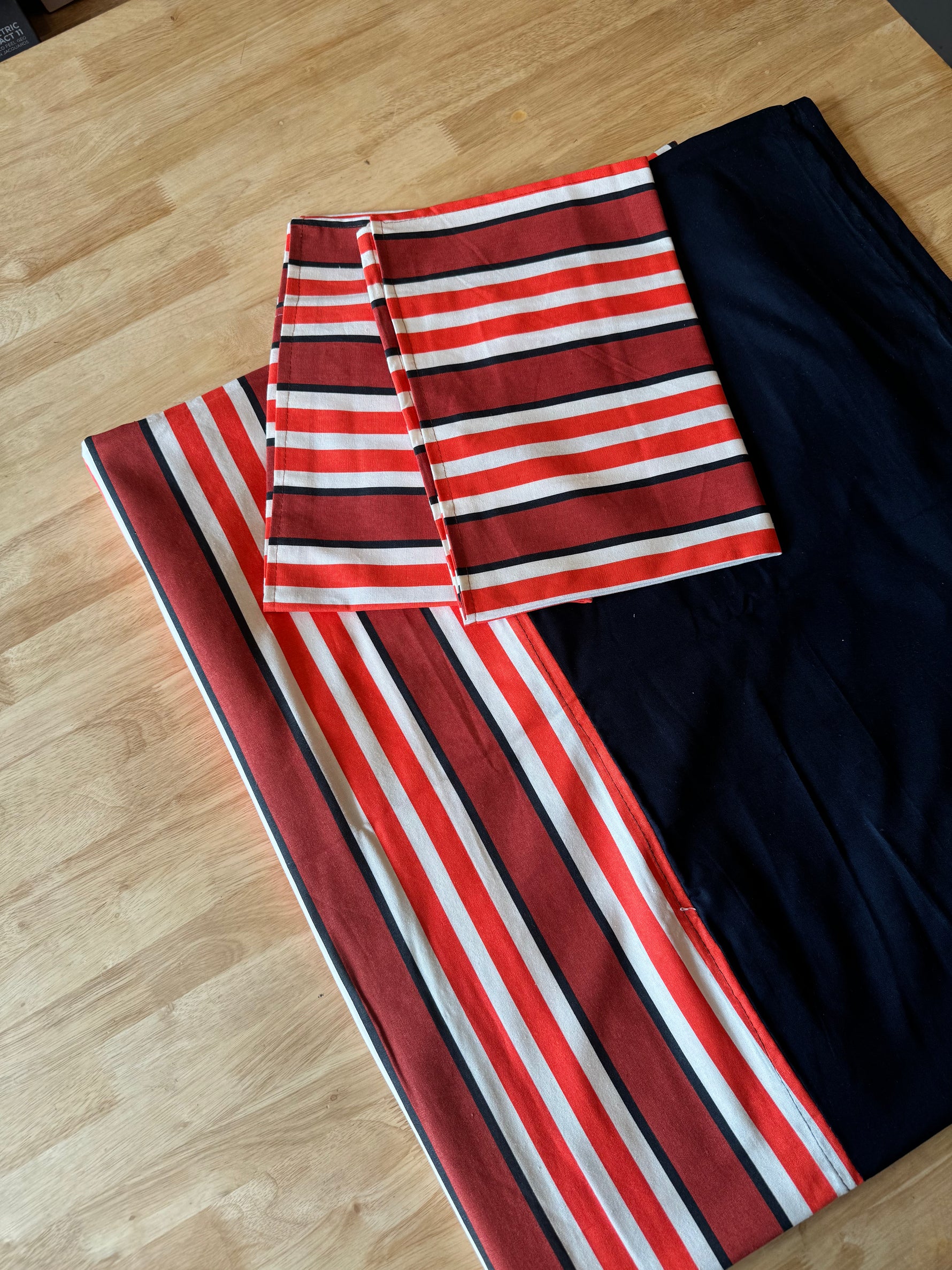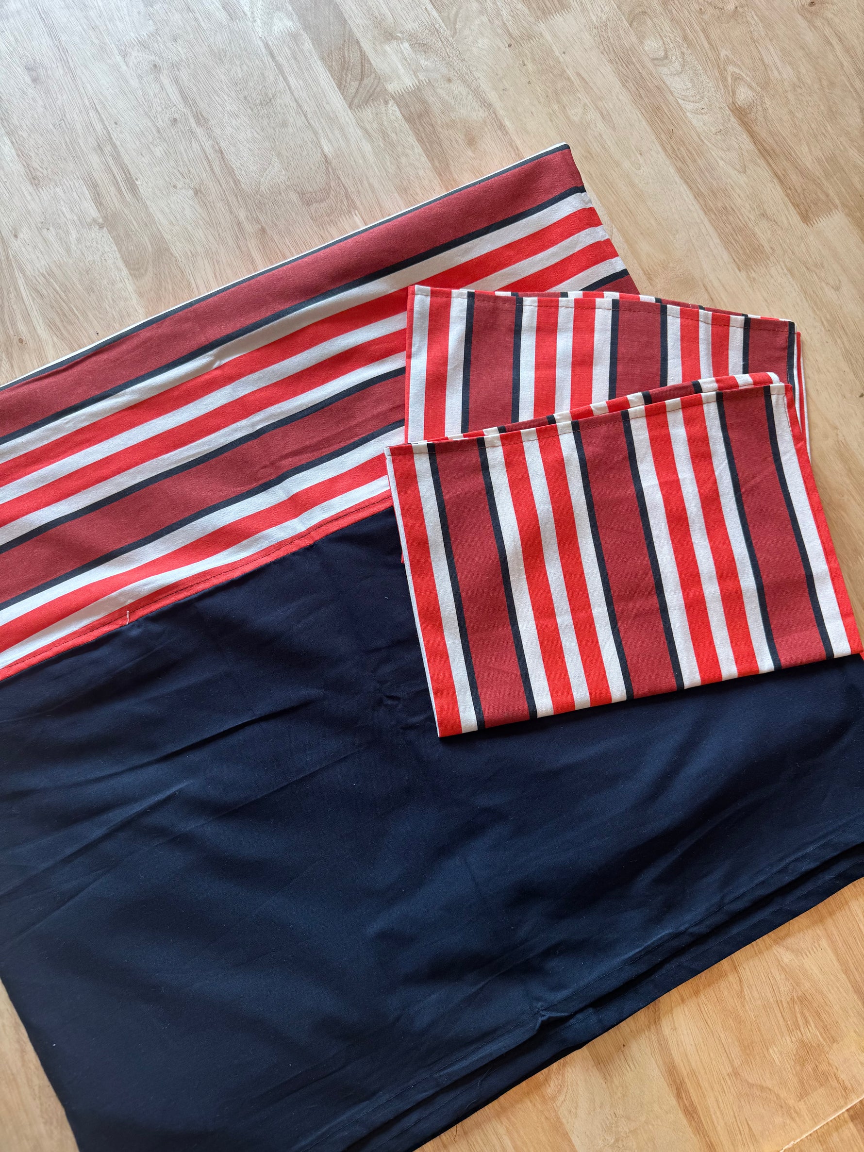 designs featuring red, white, and dark blue/black stripes are common in handwoven cotton bedsheets, such as Kerala handloom or Lalpatta styles. King Size border bed sheet 100 x 110*